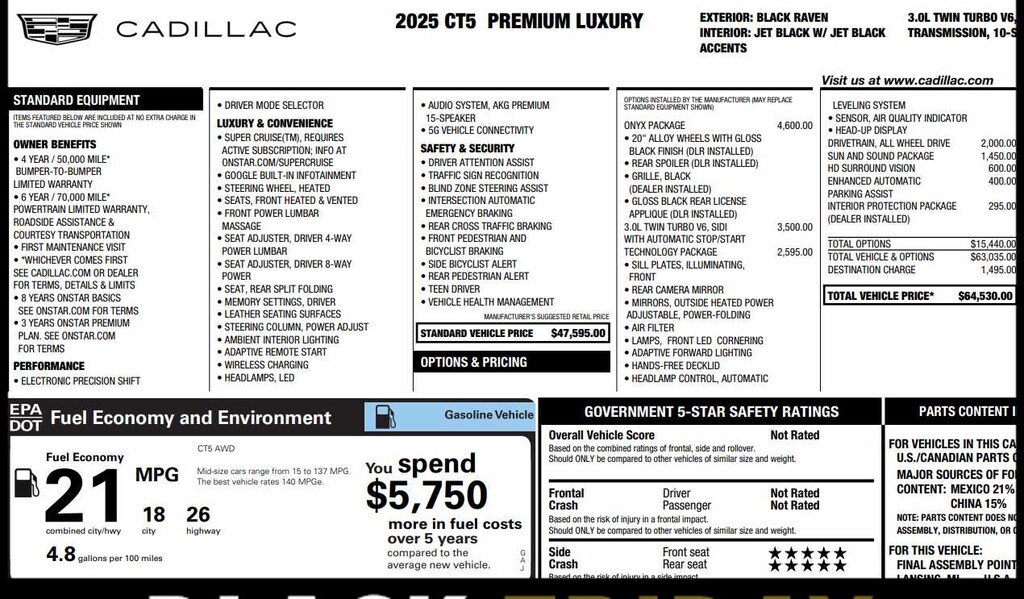 LPO, ONYX PACKAGE includes (SSJ) 20 alloy wheels with Gloss Black finish, LPO, (SPZ) Black Wheel Locks, LPO, (SPY) Black Wheel lug nuts, LPO, (RIK) Gloss Black nameplates, LPO, (5JS) Black mirror caps, LPO, (5XR) Black grille, LPO and (RXX) Gloss Black rear license plate applique, LPO (Includes (5V5) Black Rear spoiler, LPO. ENGINE, 3.0L TWIN TURBO V6, SIDI with Automatic Stop/Start (335 hp [250 kW] @ 5400 rpm, 405 lb-ft of torque [550 N-m] @ 2350-4000 rpm), LPO, 20 (50.8 CM) ALLOY WHEELS WITH GLOSS BLACK FINISH (Includes (QES) 255/35ZR20 all-season, run-flat tires. TECHNOLOGY PACKAGE includes (DXR) outside heated power-adjustable, body-color, power-folding and driver-side auto-dimming with integrated turn signal indicators, (DRZ) Rear Camera Mirror, (TL3) Hands-Free decklid release, (K6L) Pollutant, odor and fine dust air filter, (USK) air quality sensor, (UV6) Head-Up Display, (T95) Adaptive Forward Lighting headlamps, (TR7) Automatic leveling headlamp system, (UWN) Premium headlamp system, (T87) front cornering lamps and (B7G) illuminating front sills with Cadillac crest logo, DRIVETRAIN, ALL-WHEEL DRIVE, SUN AND SOUND PACKAGE includes (C3U) sunroof and (UQS) AKG Premium Audio, HD SURROUND VISION, ENHANCED AUTOMATIC PARKING ASSIST, LPO, INTERIOR PROTECTION PACKAGE includes (VAV) All-weather floor mats, LPO and (VLI) All-weather cargo mat, LPO, TRANSMISSION, 10-SPEED AUTOMATIC.