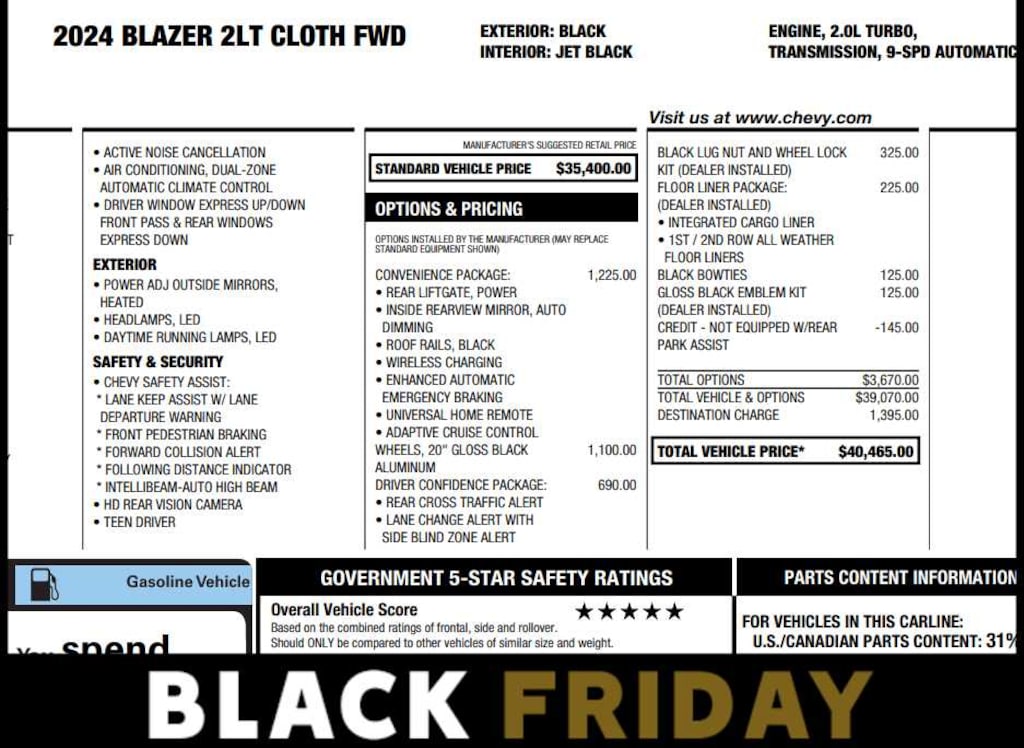This is one impressive car. I purchased the Chevrolet Blazer with 6 cylinder engine. It has everything I want. Great acceleration, Great styling, Quiet engine, Well equiped, I really like the turn signals in the mirrors, push button start, blind spot monitoring, cross traffic monitoring, Continental Tires, and easy pairing of cell phone. I did not get AWD or GPS. There is nothing, I would change and for the price, a great deal to boot. You won't be disappointed.… - 5.0