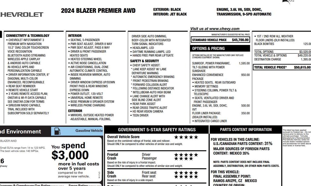 This is one impressive car. I purchased the Chevrolet Blazer with 6 cylinder engine. It has everything I want. Great acceleration, Great styling, Quiet engine, Well equiped, I really like the turn signals in the mirrors, push button start, blind spot monitoring, cross traffic monitoring, Continental Tires, and easy pairing of cell phone. I did not get AWD or GPS. There is nothing, I would change and for the price, a great deal to boot. You won't be disappointed.… - 5.0