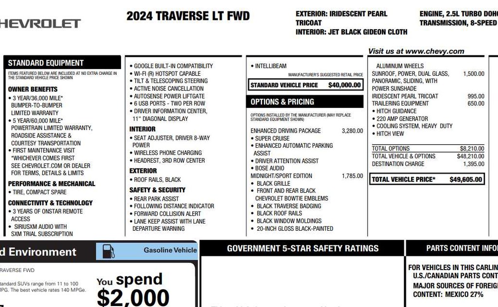 ENHANCED DRIVING PACKAGE includes (UKL) Super Cruise, (UKZ) Enhanced Automatic Parking Assist and (ULM) Driver ATTENTION ASSIST® (Also includes (UQA) Bose premium 10-speaker audio system. MIDNIGHT/SPORT EDITION includes Black grille with unique finish, Chevrolet Black bowties, Black nameplate (and AWD badge on AWD models), (BSW) high gloss Black door upper and low gloss Black belt moldings, (SLV) 20" High Gloss Black painted aluminum wheels and (Q3N) 255/55R20 all-season blackwall tires, SUNROOF, POWER, DUAL GLASS, PANORAMIC, SLIDING, WITH POWER SUNSHADE, TRAILERING PACKAGE includes Hitch with hitch cover, (PZ8) Hitch View, (CTT) Hitch Guidance, (V08) heavy-duty cooling system and (KW5) 220 amp alternator, AUDIO SYSTEM, 17.7" DIAGONAL ADVANCED COLOR HIGH-CONTRAST LCD DISPLAY with Google built-in compatibility (select service plan required, terms and limitations apply), including navigation capability, connected apps, personalized profiles for each driver's settings, Natural Voice Recognition and Phone Integration for Wireless Apple CarPlay® and Wireless Android Auto® for compatible phones (STD), ENGINE, 2.5L TURBO DOHC SIDI WITH VARIABLE VALVE TIMING (VVT) (328 hp [244 kW] @ 5500 rpm, 326 lb-ft of torque [442 N-m] @ 3500 rpm) (STD), TRANSMISSION, 8-SPEED AUTOMATIC (STD). AutoCheck One Owner