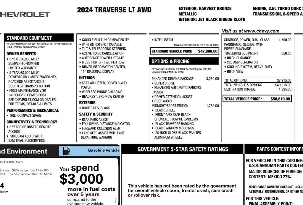 ENHANCED DRIVING PACKAGE includes (UKL) Super Cruise, (UKZ) Enhanced Automatic Parking Assist and (ULM) Driver ATTENTION ASSIST® (Also includes (UQA) Bose premium 10-speaker audio system. MIDNIGHT/SPORT EDITION includes Black grille with unique finish, Chevrolet Black bowties, Black nameplate (and AWD badge on AWD models), (BSW) high gloss Black door upper and low gloss Black belt moldings, (SLV) 20" High Gloss Black painted aluminum wheels and (Q3N) 255/55R20 all-season blackwall tires, SUNROOF, POWER, DUAL GLASS, PANORAMIC, SLIDING, WITH POWER SUNSHADE, TRAILERING PACKAGE includes Hitch with hitch cover, (PZ8) Hitch View, (CTT) Hitch Guidance, (V08) heavy-duty cooling system and (KW5) 220 amp alternator, AUDIO SYSTEM, 17.7" DIAGONAL ADVANCED COLOR HIGH-CONTRAST LCD DISPLAY with Google built-in compatibility (select service plan required, terms and limitations apply), including navigation capability, connected apps, personalized profiles for each driver's settings, Natural Voice Recognition and Phone Integration for Wireless Apple CarPlay® and Wireless Android Auto® for compatible phones (STD), ENGINE, 2.5L TURBO DOHC SIDI WITH VARIABLE VALVE TIMING (VVT) (328 hp [244 kW] @ 5500 rpm, 326 lb-ft of torque [442 N-m] @ 3500 rpm) (STD), TRANSMISSION, 8-SPEED AUTOMATIC (STD). AutoCheck One Owner