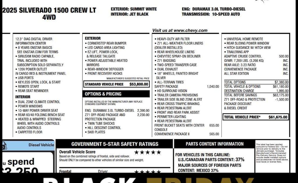 (305 hp [227 kW] @ 3750 rpm, 495 lb-ft of torque [671 Nm] @ 2750 rpm) Includes (KW5) 220-amp alternator and (K05) engine block heater. includes (Z71) Off-Road suspension, (JHD) Hill Descent Control, (NZZ) skid plates and (K47) heavy-duty air filter Includes Z71 hard badge, (N10) dual exhaust, (RCV) 18" bright silver painted wheels, (XCK) 265/65R18 all-terrain, blackwall tires and (NQH) 2-speed transfer case. includes (UV2) HD Surround Vision, (UD5) Front and Rear Park Assist, (TRG) Trailer Camera Provisions, (UKV) Trailer Side Blind Zone Alert, (UFB) Rear Cross Traffic Braking, (UKK) Rear Pedestrian Alert and (U12) Perimeter Lighting, includes (B1J) wheel house liners and (CGN) Chevytec spray-on bedliner, with center console (Includes (EPH) Electronic Transmission Range Selector (console mounted). includes (UG1) Universal Home Remote, (A48) rear sliding power window, (PZ8) Hitch Guidance with Hitch View and (UET) Trailering App, ADAPTIVE CRUISE CONTROL, includes (BTV) Remote Start, (UTJ) Theft-deterrent system and (C49) rear-window defogger, with Google built-in compatibility (select service plan required, terms and limitations apply) including navigation capability, 13.4" diagonal HD color touchscreen, includes multi-touch display, AM/FM stereo, Bluetooth® streaming audio for music and most phones; featuring Wireless Apple CarPlay® and Wireless Android Auto® capability for compatible phones, advanced voice recognition, in-vehicle apps, personalized profiles for infotainment and vehicle settings (STD), with Electronic Transmission Range Selector (ETRS), electronically controlled with overdrive, tow/haul mode and steering column paddle shifters. Includes Cruise Grade Braking and Powertrain Grade Braking.