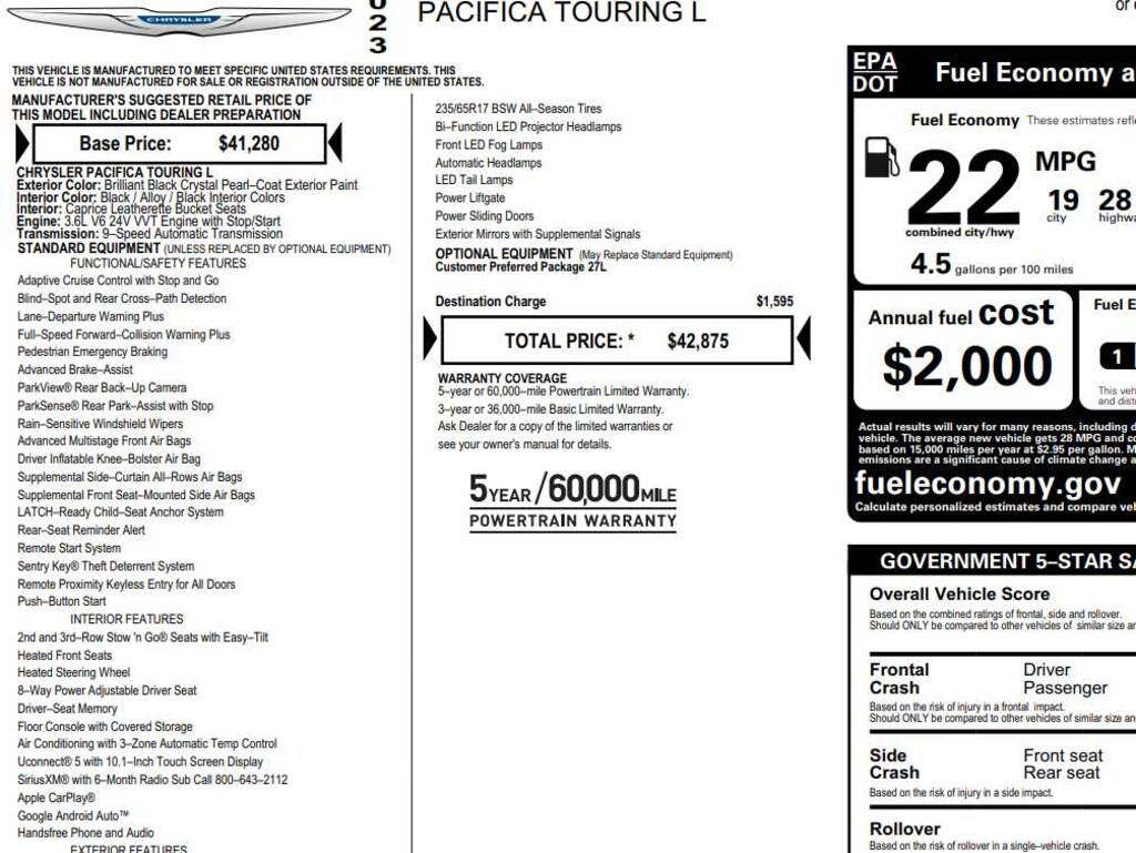 Third Row Seat, Quad Bucket Seats, Power Liftgate, Rear Air, Heated Driver Seat. Chrysler Touring L with Brilliant Black Crystal Pearlcoat exterior and Black/Alloy/Black interior features a V6 Cylinder Engine with 287 HP at 6400 RPM*.