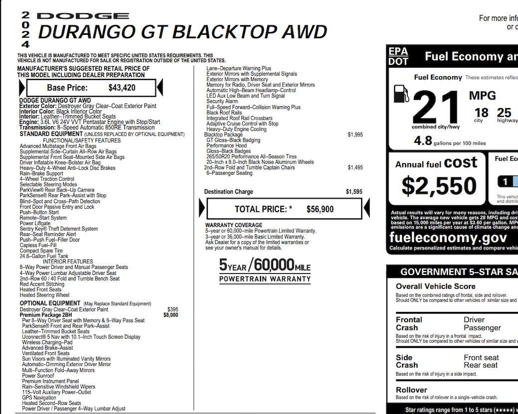 QUICK ORDER PACKAGE 2BH GT PREMIUM Engine: 3.6L V6 24V VVT UPG I w/ESS, Transmission: 8-Speed Automatic (850RE), 7 & 4 Pin Wiring Harness, For Details Visit DriveUconnect.com, Integrated Roof Rail Crossbars, Power Driver/Passenger 4-Way Lumbar Adjust, Bright Front Door Sill Scuff Pads, 1-Year Trial (Registration Required), 506 Watt Amplifier, Dual Remote USB Port - Charge Only, Class IV Receiver Hitch, Security Alarm, Floor Console w/Leather Armrest, Power 6x9 Multi-Function Foldaway Mirrors, Power Tilt & Telescopic Steering Column, 9 Alpine Amplified Speakers w/Subwoofer, Advanced Brake Assist, Disassociated Touchscreen Display, Wireless Charging Pad, Power 8-Way Driver Memory 8-Way Passenger Seats, Ventilated Front Seats, SiriusXM Guardian - Included Trial (B), Full Speed Forward, BLACKTOP PACKAGE GT Gloss Black Badging, Wheels: 20 x 8.0 Black Noise Aluminum, Performance Hood, Tires: 265/50R20 Performance AS, Integrated Roof Rail Crossbars, Satin Black Dodge Tail Lamp Badge, Black Roof Rails, Pirelli Brand Tires, Gloss Black Badges, 2ND ROW FOLD/TUMBLE CAPTAIN CHAIRS 2nd Row Mini Console w/Cupholders, 2nd Row Seat Mounted Inboard Armrests, 6 Passenger Seating, 3rd Row Floor Mat & Mini Console, TRANSMISSION: 8-SPEED AUTOMATIC (850RE) (STD), ENGINE: 3.6L V6 24V VVT UPG I W/ESS (STD).