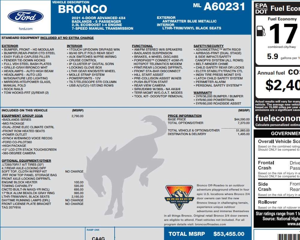 EQUIPMENT GROUP 333A HIGH PACKAGE Reverse Sensing System, Power Outlet - Back Side of Center Floor Console, 12 LCD Capacitive Touchscreen w/Swipe Capability, Front Row Heated Seats, Auto-Dimming Interior Rearview Mirror, Dr & Pass Illuminated Sliding Visor Vanity Mirrors, Additional Sound Deadening, Information on Demand Panel, Dual-Zone Electronic Automatic Temperature Control, air conditioning, Ford Co-Pilot360, Enables compatibility w/FordPass performance app w/off-road navigation, Auto High-Beam Headlamps, Pre-Collision Assist w/Automatic Emergency Braking, pedestrian detection, forward collision warning and dynamic brake support, Blind Spot Information System (BLIS), Cross-Traffic Alert, Rear View Camera, backup assist grid lines, Lane-Keeping System, Lane-Keeping Alert, Lane-Keeping, BLACK ONYX, LEATHER-TRIMMED/VINYL BUCKET SEATS 10-way power driver seat, 8-way front passenger seat, second row armrest w/2 beverage holders and front driver/passenger seat back MOLLE strap system, Carpet flooring replaces the standard rubberized flooring, WHEELS: 17 BLACK HIGH GLOSS-PAINTED ALUMINUM (64W) carbonized gray beauty ring and beadlock capable, TOWING CAPABILITY, DAYTIME RUNNING LAMPS (DRL) (NON-CONFIGURABLE) Replaces the standard configurable Daytime Running Lamps (DRL).