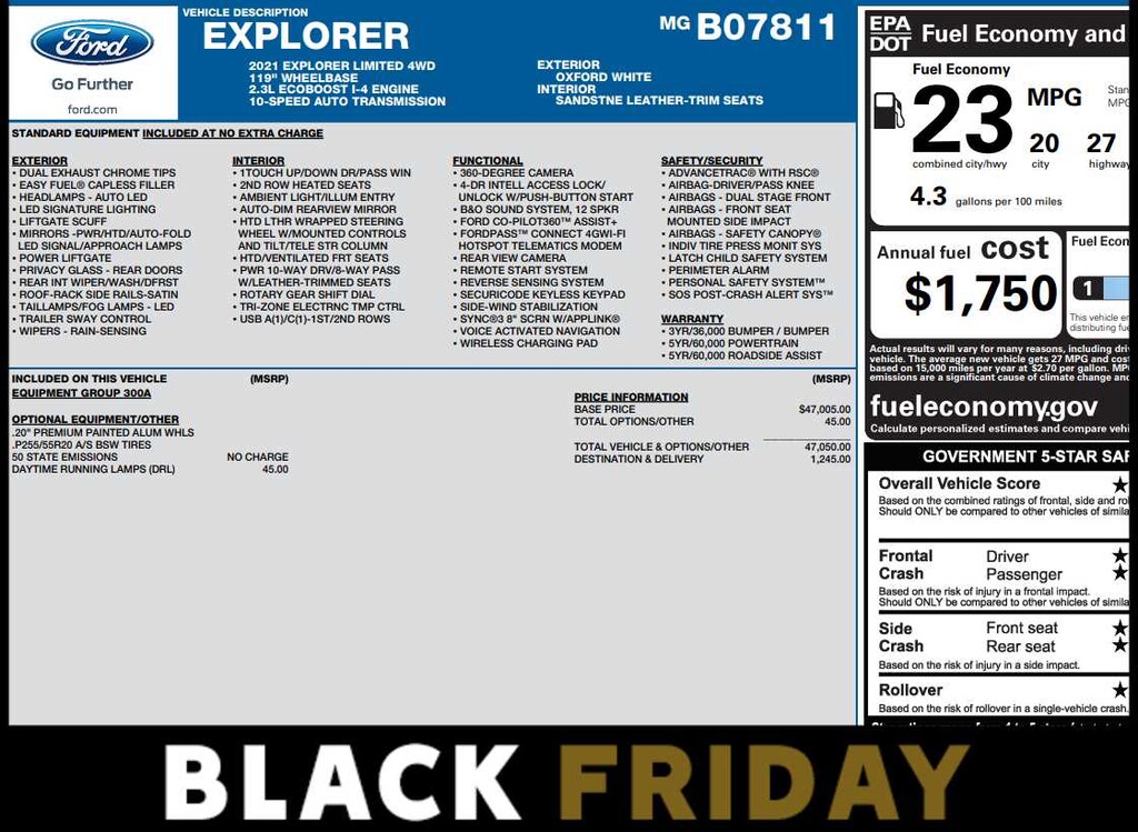 Leather Seats, Third Row Seat, Navigation, Quad Bucket Seats, Power Liftgate Ford Limited with Oxford White exterior and Sandstone interior features a 4 Cylinder Engine with 300 HP at 5500 RPM*.