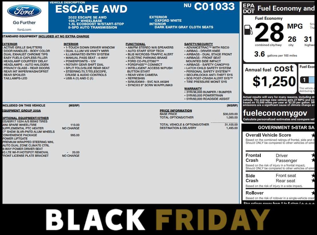 Back-Up Camera, Satellite Radio, iPod/MP3 Input, Onboard Communications System, Aluminum Wheels. Ford SE with Oxford White exterior and Dark Earth Gray interior features a 3 Cylinder Engine with 181 HP at 6000 RPM*.