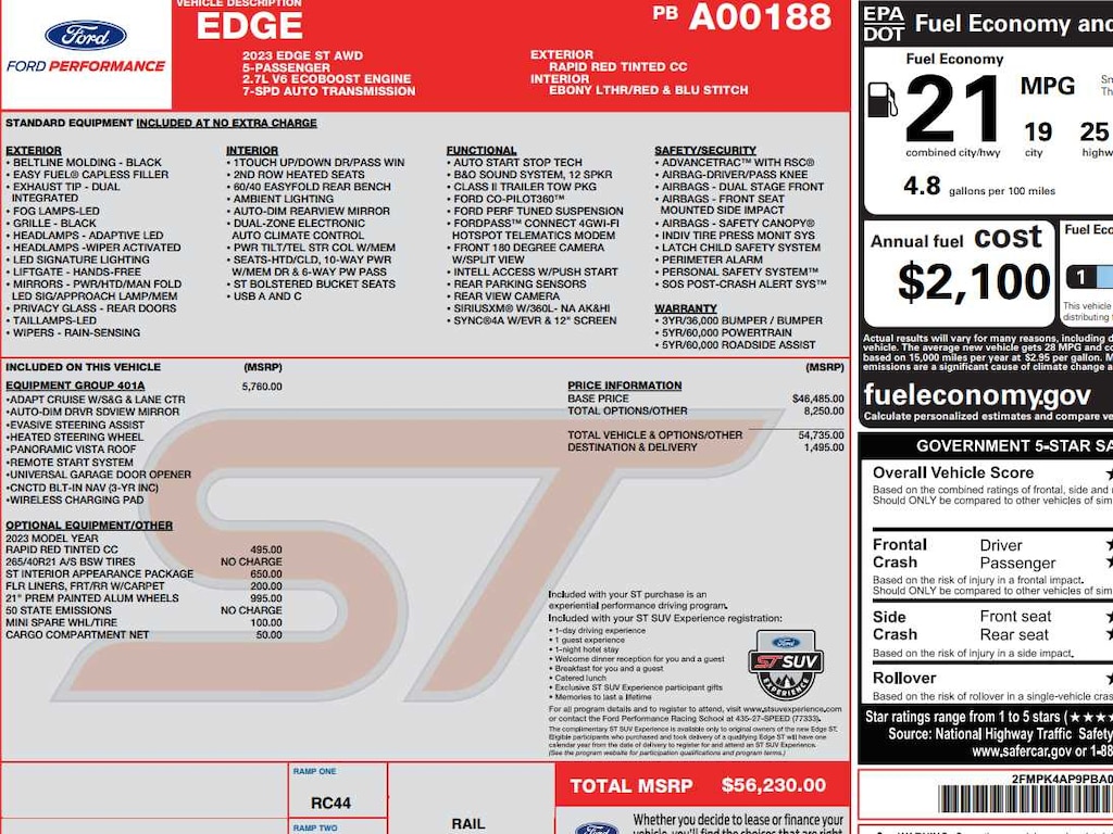 Universal Garage Door Opener (UGDO), Active Transmission Warm-Up, Power Tilt/Telescoping Steering Column w/Memory, Evasive Steering Assist, Heated Rear Seats, Lane Centering, Enhanced Active Park Assist, parallel park, park out assist, reverse perpendicular parking, forward and reverse and side sensing systems, Remote Start System, Wireless Charging Pad, Foot Activated Hands-Free Liftgate, Adaptive Cruise Control w/Stop & Go, Adaptive LED Headlamps, LED amber light blade turn signals, 110V/150W AC Power Outlet, Front 180-Degree Camera w/Split View, Auto-Dimming Drivers Sideview Mirror, Panoramic Vista Roof, power open/close w/power shade, Standard 2nd row LED dome light is replaced w/2 single lights, Switch located in each grab handle pocket, Connected Built-In Navigation, 3 years of, Tires: 265/40R21 All-Season BSW, Perforated Leather Steering Wheel w/ST Logo, race red and raptor blue stitching, standard front and rear carpeted floor mats.