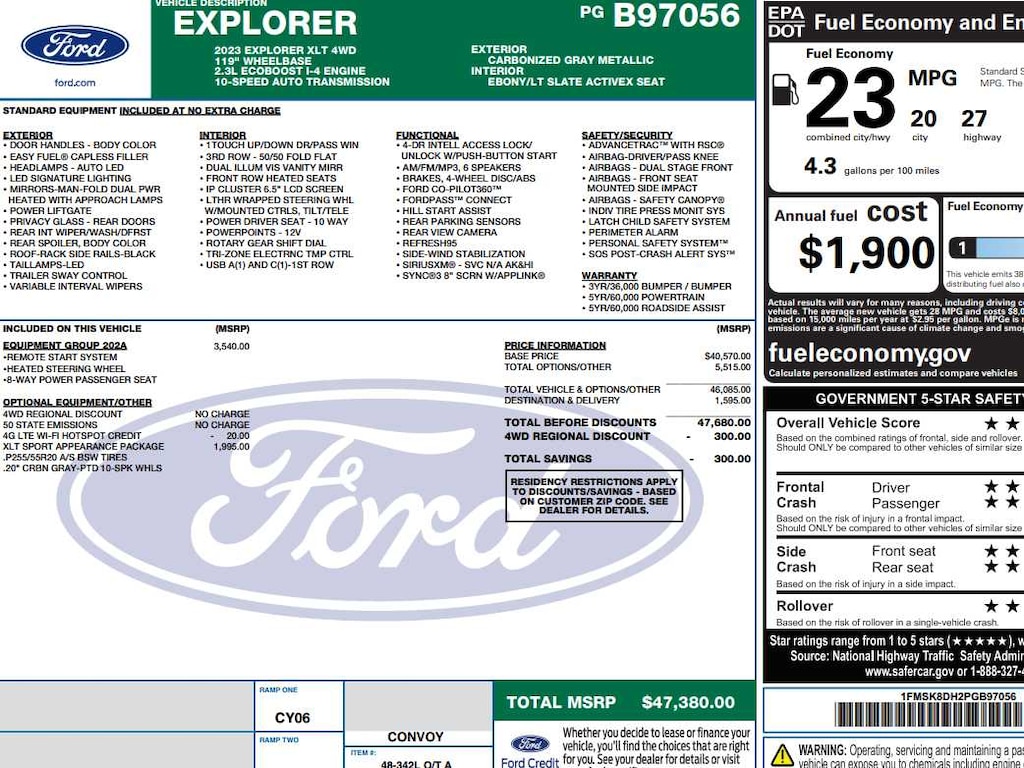 EQUIPMENT GROUP 202A SecuriCode Keyless Entry Keypad, Acoustic-Laminated Front Side Windows, Remote Start System, Heated Steering Wheel, LED Fog Lamps, silver-painted front skid plate elements, XLT SPORT APPEARANCE PACKAGE carbonized gray-painted grille bars and mesh insert, liftgate applique, lower body side cladding insert, skid plate elements, carbonized gray EXPLORER badge on hood, stretch diamond instrument panel appliques, ebony/light slate seats w/medium slate contrast stitching in all rows, unique light slate door-trim panel insert w/contrast stitching and sideview mirrors w/gloss black caps, Wheels: 20 10-Spoke Carbonized Gray-Painted, Tires: P255/55R20 AS BSW, Dual Chrome Exhaust Tips, TRANSMISSION: 10-SPEED AUTOMATIC (STD).