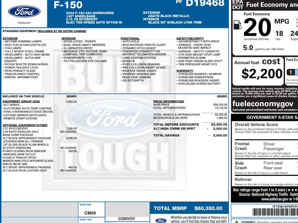 EQUIPMENT GROUP 302A HIGH Class IV Trailer Hitch Receiver, towing capability up to TBD lbs, on 3.3L V6 PFDI engine (99B) and 2.7L EcoBoost engine (99P) or up to TBD lbs, on 3.5L EcoBoost engine (998) and 5.0L V8 engine (995), 7/4-pin connector, class IV trailer hitch receiver, smart trailer tow connector ( BLIS w/trailer tow coverage where BLIS is available), XLT Chrome Appearance Package, lower grille trim, Chrome Single-Tip Exhaust, Tires: 275/65R18 BSW Automatic Transmission, Chrome Door & Tailgate Handles w/Body-Color Bezel, bezel on side doors and black on tailgate, Wheels: 18 Chrome-Like PVD, 2-Bar Style Grille w/Chrome 2 Minor Bars, silver painted surround and black background mesh, Bright Polished Step Bars, Zone Lighting, Intelligent Access w/Push Button Start, approach detection, SecuriCode, XLT BLACK APPEARANCE PACKAGE Black 6 Angular Step Bars, Black Exterior Badging, Wheels: 20 Gloss Black Painted Aluminum, Tires: 275/60R20 BSW AT, Unique Hood & Grille w/Black Accent, Dark Interior Appliques, Matte Black Tailgate F-150 Decal, ENGINE: 2.7L V6 ECOBOOST 3.55 Axle Ratio, GVWR: 6,600 lbs Payload Package, TRANSMISSION: ELECTRONIC 10-SPEED AUTOMATIC selectable drive modes: normal, ECO, sport, tow/haul, slippery, deep snow/sand and mud/rut (STD).