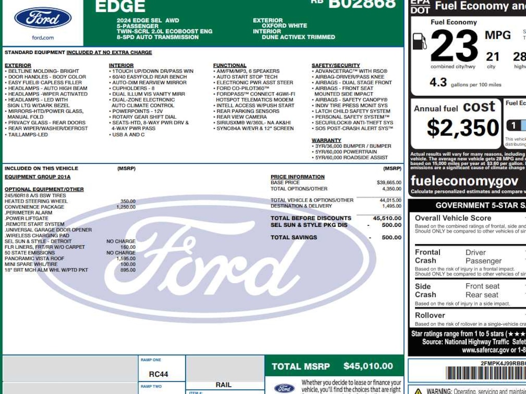 PANORAMIC VISTA ROOF power open/close w/power shade, Standard 2nd row LED dome light is replaced w/2 single lights, Switch located in each grab handle pocket, CONVENIENCE PACKAGE Wireless Charging Pad, Universal Garage Door Opener (UGDO), Perimeter Alarm, Power Liftgate, Remote Start System, Fog Lamps w/Iconic Silver Bezel, 110V/150W AC Power Outlet, WHEELS: 18 BRIGHT-MACHINED ALUMINUM premium dark stainless-painted pockets, HEATED STEERING WHEEL, ENGINE: TWIN-SCROLL 2.0L ECOBOOST auto start-stop technology (STD).