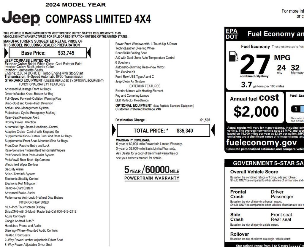 4x4, Heated Driver Seat, Back-Up Camera, Premium Sound System, Satellite Radio Jeep Limited with Bright White Clearcoat exterior and Black interior features a 4 Cylinder Engine with 200 HP at 5000 RPM*.