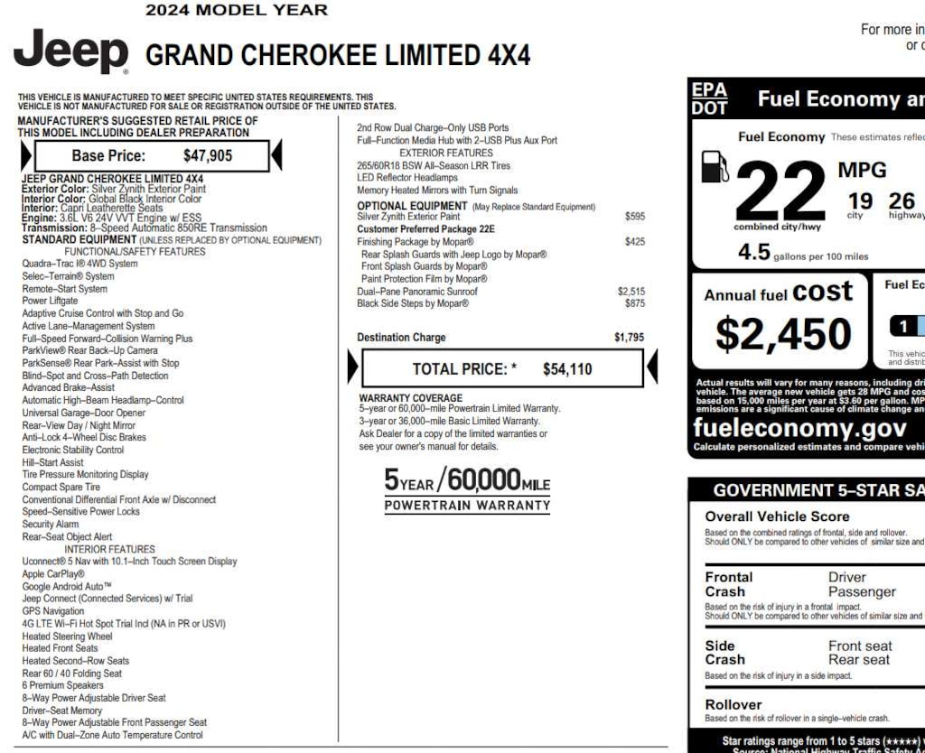 Navigation, 4x4, Power Liftgate, Heated Driver Seat, Heated Rear Seat. Jeep Limited with Silver Zynith exterior and Global Black interior features a V6 Cylinder Engine with 293 HP at 6400 RPM*.