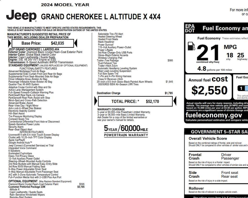 QUICK ORDER PACKAGE 23M ALTITUDE X Engine: 3.6L V6 24V VVT UPG I w/ESS, Transmission: 8-Speed Automatic (8HP50), Altitude X, Selectable Tire Fill Alert, Remote Start System, Rain Sensitive Windshield Wipers, Wireless Charging Pad, Heated Front Seats, Black Headliner, Power Sunroof, Delete Laredo Badge, 3rd Row Charge-Only USB Ports, 115V Auxiliary Power Outlet, Gloss Black Exterior Accents, Heated Steering Wheel, Power Liftgate, WHEELS: 20 X 8.5 GLOSS BLACK PAINTED ALUMINUM Tires: 265/50R20 BSW A/S LRR, TRAILER TOW PACKAGE Rear Load Leveling Suspension, Full Size Spare Tire, 180 Amp Alternator, 7 & 4 Pin Wiring Harness, Dual Exhaust Tips, Heavy Duty Engine Cooling, 18 Full-Size Steel Spare Wheel, Automatic Headlamp Leveling System, Trailer Hitch Zoom, Class IV Receiver Hitch, TRANSMISSION: 8-SPEED AUTOMATIC (8HP50), ENGINE: 3.6L V6 24V VVT UPG I W/ESS (STD).