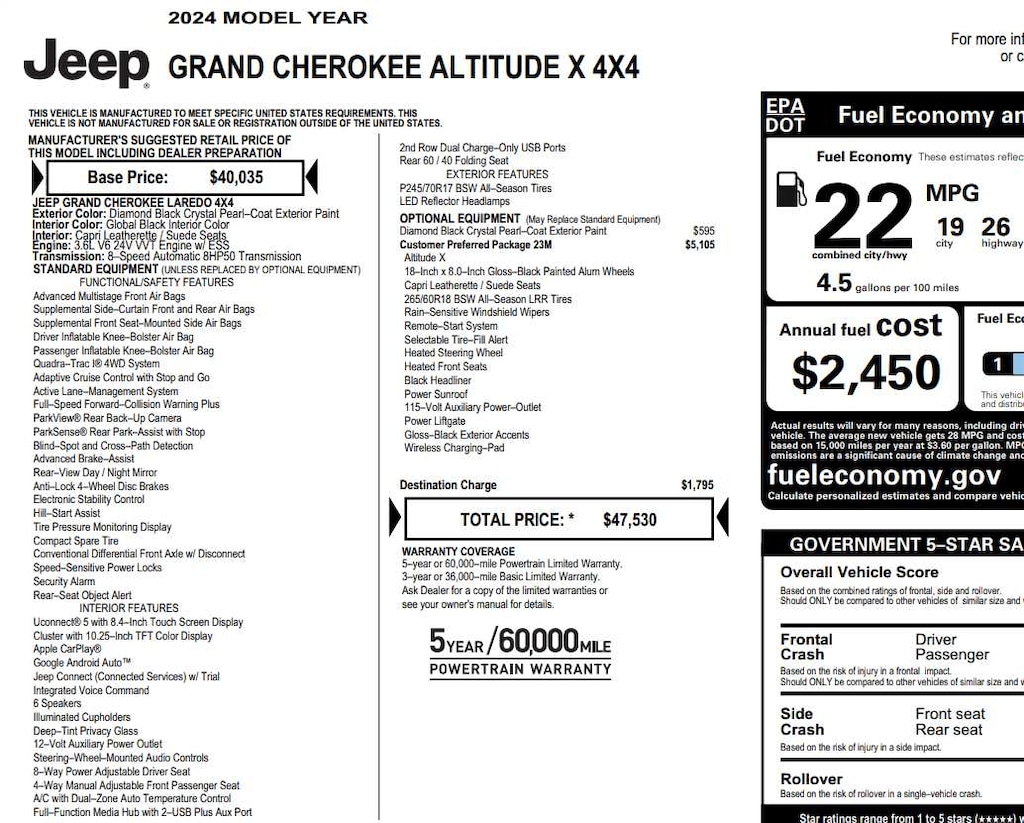 QUICK ORDER PACKAGE 23M ALTITUDE X Engine: 3.6L V6 24V VVT UPG I w/ESS, Transmission: 8-Speed Automatic 8HP50, Altitude X, Selectable Tire Fill Alert, Remote Start System, Rain Sensitive Windshield Wipers, Wireless Charging Pad, Heated Front Seats, Black Headliner, Power Sunroof, Delete Laredo Badge, 115V Auxiliary Power Outlet, Gloss Black Exterior Accents, Heated Steering Wheel, Power Liftgate, TRANSMISSION: 8-SPEED AUTOMATIC 8HP50, ENGINE: 3.6L V6 24V VVT UPG I W/ESS (STD).