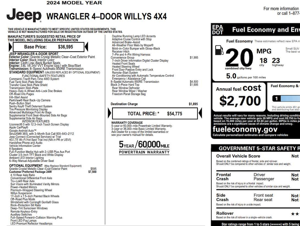 QUICK ORDER PACKAGE 24W WILLYS Engine: 3.6L V6 24V VVT UPG I w/ESS, Transmission: 8-Speed Automatic (850RE), Speed Sensitive Power Locks, 7 & 4 Pin Wiring Harness, Conventional Differential Front Axle, 4-Wheel Drive Swing Gate Decal, Black Grille, Injection Molded Black Rear Bumper, Dana M210 Wide HD Tube Front Axle, Front 1-Touch Down Power Windows, Daytime Running Lamps LED Accents, Front LED Fog Lamps, LED Premium Reflector Headlamps, E-Locker Rear Axle, Corning Gorilla Glass, Security Alarm, Willys, Class II Receiver Hitch, Mold In Color Bumper w/Gloss Black, Advanced Brake Assist, Automatic Headlamps, Off-Road Plus Mode, 240 Amp Alternator, Willys Hood Decal, Full Speed Forward Collision Warning Plus, Rock Protection Sill Rails, 97 MPH Vehicle Max Speed Calibration, Power Heated, TRANSMISSION: 8-SPEED AUTOMATIC (850RE) Adaptive Cruise Control w/Stop, Anti-Lock 4-Wheel Disc Brakes, Dana M200 Rear Axle, Selec-Speed Control, CONVENIENCE GROUP Emergency/Assistance Call, 2-Door Passive Entry, Front Door Locks, Remote Start System, Cluster 7.0 TFT Color Display, Universal Garage Door Opener, Heated Front Seats, Air Conditioning w/Auto Temp Control, Heated Steering Wheel, Air Filtering, BLACK 3-PIECE HARD TOP Freedom Panel Storage Bag, Rear Window Defroster, Rear Window Wiper/Washer, No Soft Top, ENGINE: 3.6L V6 24V VVT UPG I W/ESS (STD). AutoCheck One Owner