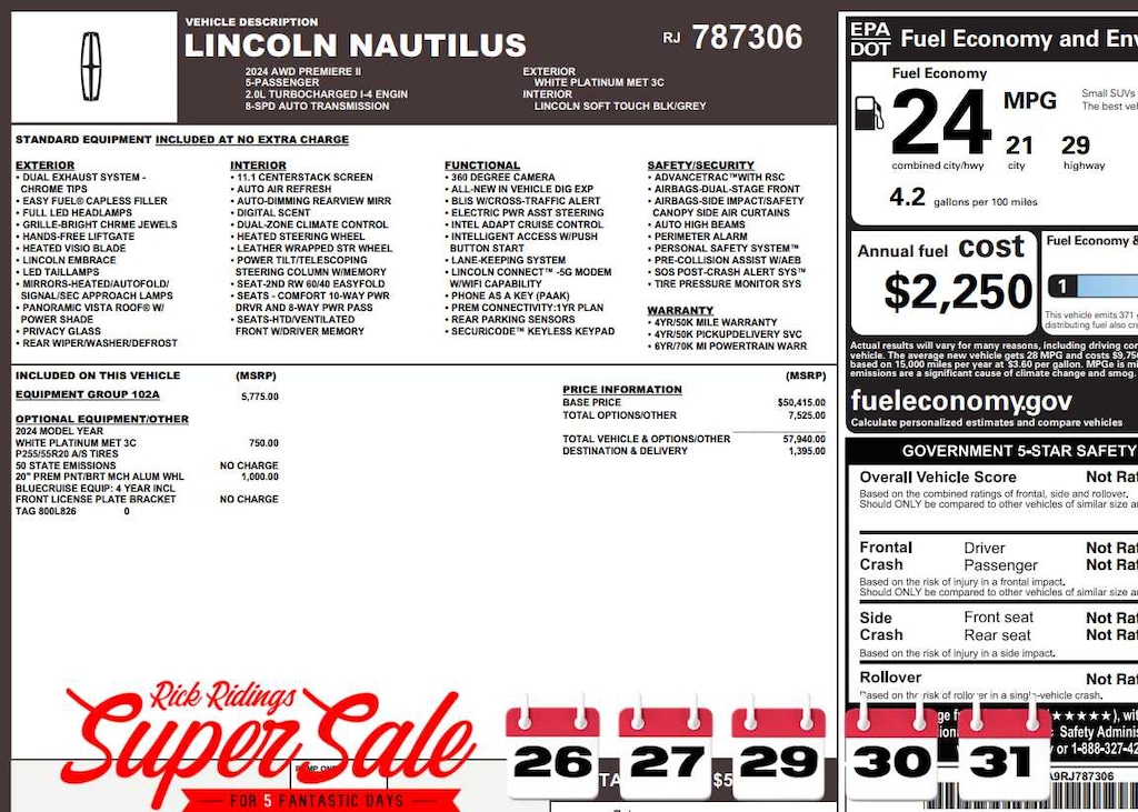 Panoramic Vista Roof, Hands-Free Power Liftgate, Revel Audio System w/14 Speakers & HD Radio, SiriusXM radio and AM/FM, 110V Power Converter, Digital Scent, 3 scent cartridges (violet cashmere, mystic forest, ozonic azure), Lincoln BlueCruise Equipped (4-Years Included), See lincoln.com/bluecruise for version details, Auto Air Refresh, Rear Heated Seats w/Switch Control, carbonized painted pockets, Tires: 255/55R20 AS BSW.