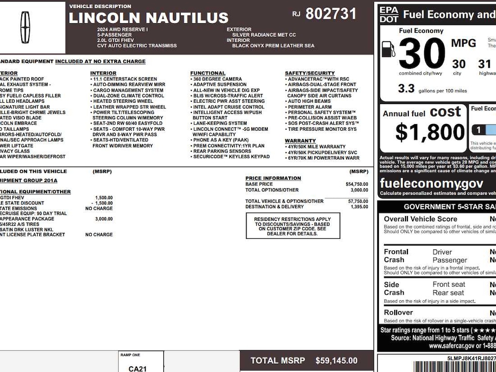 Leather Seats, Navigation, Power Liftgate, Heated Driver Seat, Cooled Driver Seat. Lincoln Reserve with Silver Radiance Metallic Clearcoat exterior and Black Onyx interior features a 4 Cylinder Engine with 250 HP at 5500 RPM*.